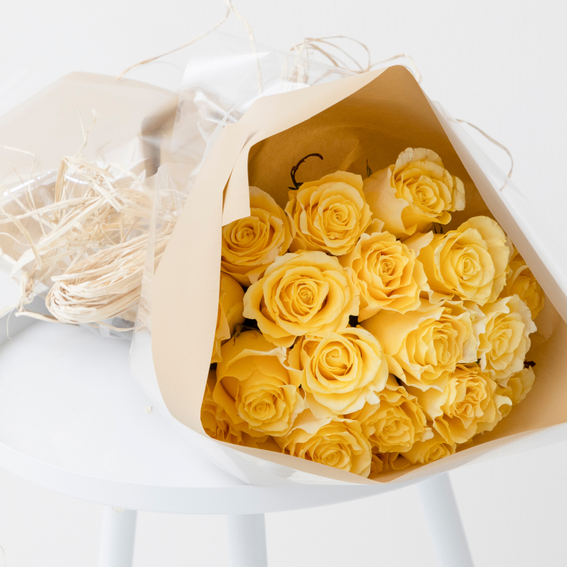 厳選された新鮮なバラのみを使用した贅沢な花束です。明るさと幸福感を象徴するカラーが元気な印象を与えます。贈り物やインテリアのアクセントとして最適です。感謝の気持ちや、お祝いの場にぴったりの一品です。